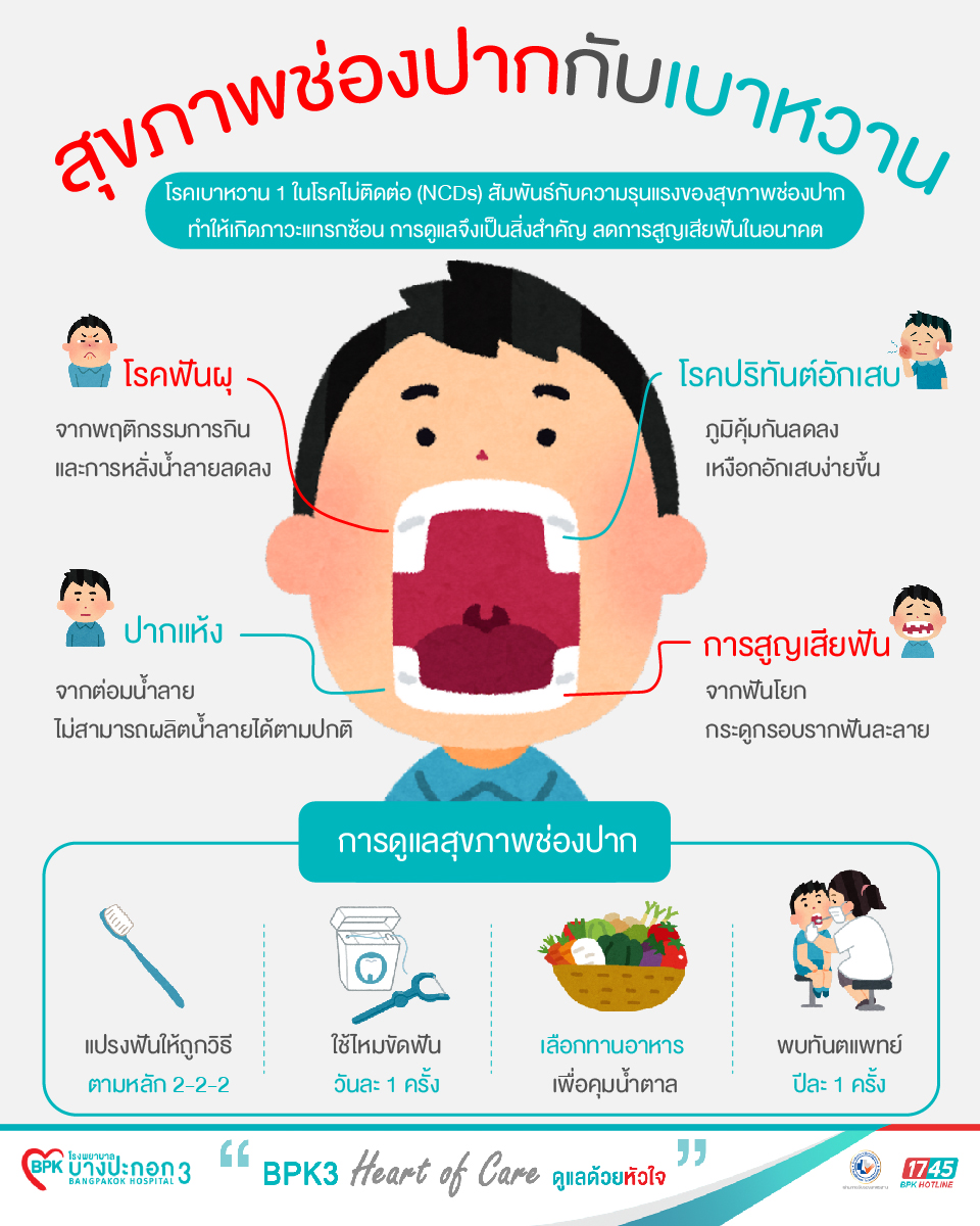 เบาหวานส่งผลให้การทำงานของต่อมน้ำลายผิดปกติ ทำให้ช่องปากขาดความชุ่มชื้น จนเกิดอาการปากแห้ง หรือเชื้อราในช่องปากได้อีกด้วย