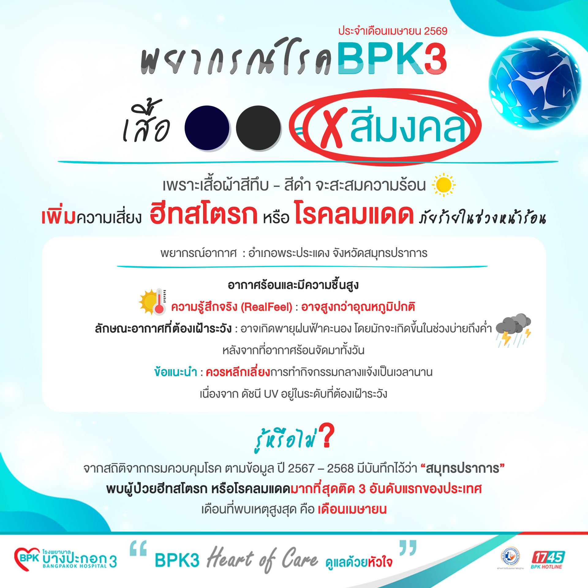จากสถิติจากกรมควบคุมโรค ตามข้อมูล ปี 2567 – 2568 มีบันทึกไว้ว่าสมุทรปราการเป็นจังหวัดที่พบผู้ป่วยฮีทสโตรก หรือโรคลมแดดมากที่สุดติด 3 อันดับแรกของประเทศไทย และเดือนที่พบเหตุสูงสุด คือ เดือนเมษายน