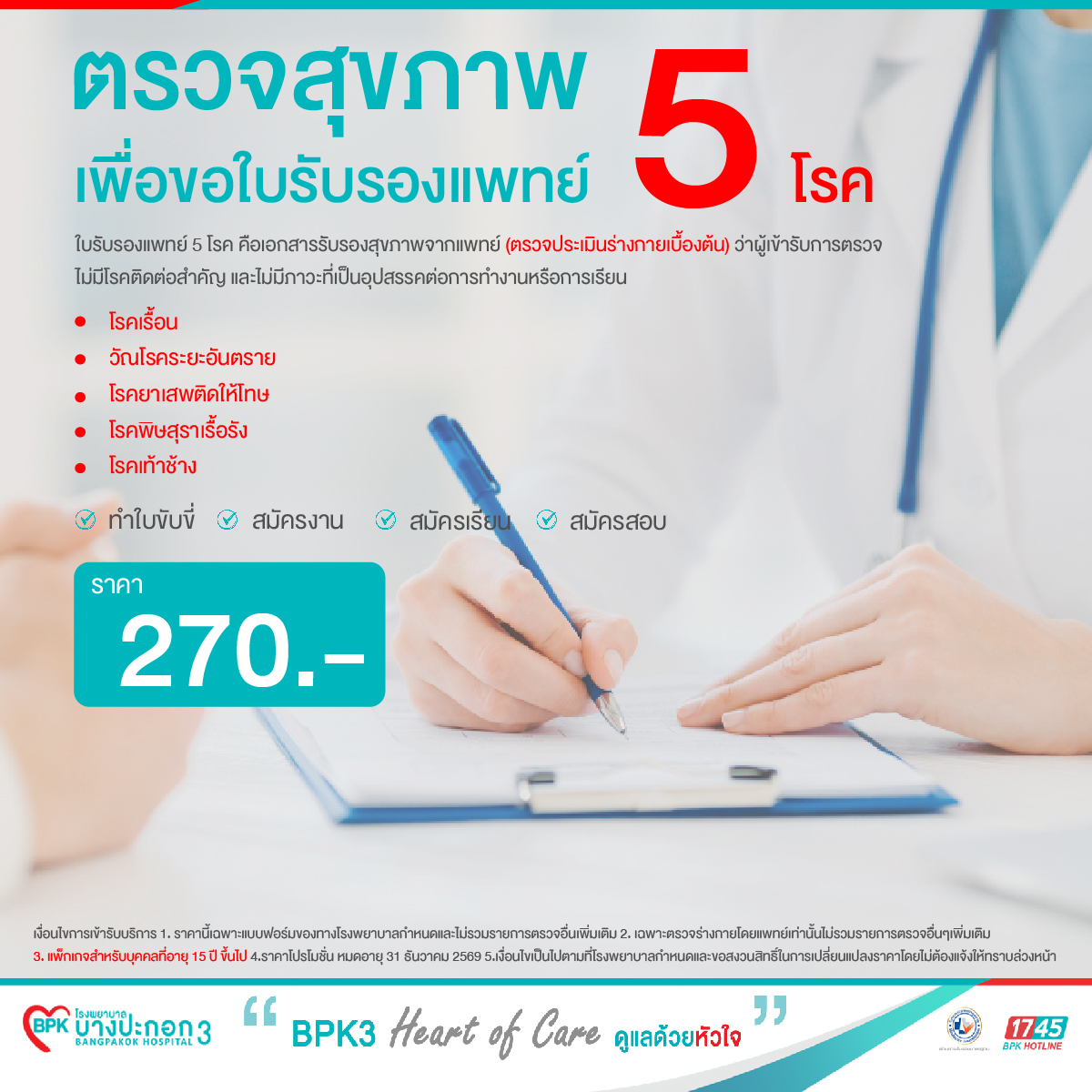 แพ็กเกจตรวจสุขภาพเพื่อขอใบรับรองแพทย์ 5 โรค ราคา 270 บาท