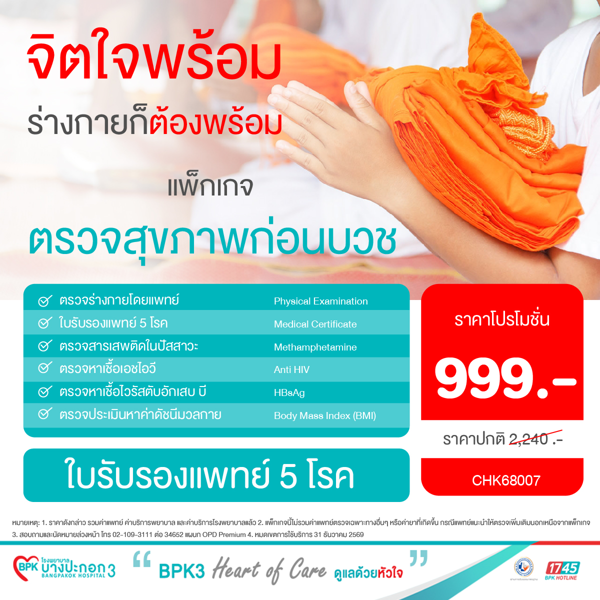 แพ็กเกจตรวจสุขภาพก่อนบวช ราคา 999 บาท จากราคาปกติ 2,240 บาท