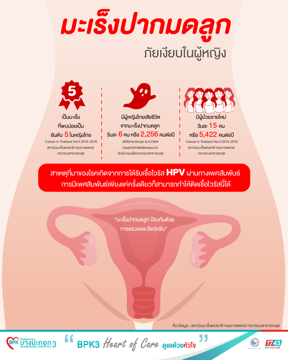 มะเร็งปากมดลูกเป็นมะเร็งอันดับต้นๆ ที่เกิดกับผู้หญิงไทย สาเหตุที่มาของโรคเกิดจากการได้รับเชื้อไวรัส HPV ผ่านทางเพศสัมพันธ์ การมีเพศสัมพันธ์เพียงแค่ครั้งเดียวก็สามารถทำให้ติดเชื้อไวรัสนี้ได้ การป้องกันมะเร็งปากมดลูกสามารถทำได้โดยการตรวจหาเชื้อ HPV หากไม่ติดเชื้อให้รีบฉีดวัคซีนป้องกัน วัคซีนสามารถฉีดป้องกันได้ตั้งแต่อายุ 9-26 ปี
