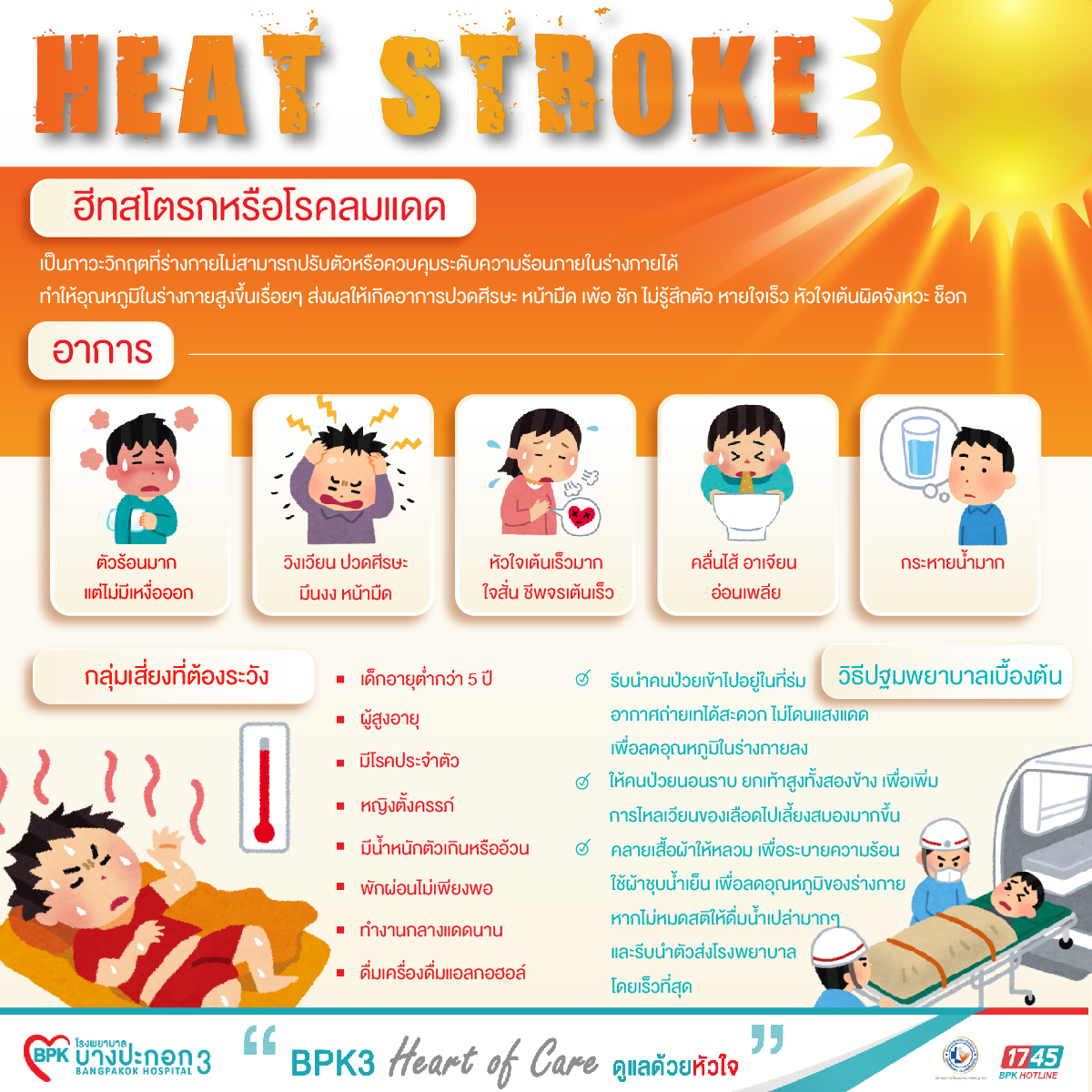 ฮีทสโตรก (Heat Stroke) หรือโรคลมแดด เป็นภาวะวิกฤตที่ร่างกายไม่สามารถปรับตัวหรือควบคุมระดับความร้อนภายในร่างกายได้ ทำให้อุณหภูมิในร่างกายสูงขึ้นเรื่อยๆ ส่งผลให้เกิดอาการปวดศีรษะ หน้ามืด เพ้อ ชัก ไม่รู้สึกตัว หายใจเร็ว หัวใจเต้นผิดจังหวะ ช็อก หากปล่อยทิ้งไว้ให้มีอาการหรือไม่สามารถระบายความร้อนออกได้มากกว่า 2 ชั่วโมง อาจส่งผลกระทบที่รุนแรงต่อหัวใจ สมอง ไต และกล้ามเนื้อ ซึ่งหากได้รับการรักษาที่ล่าช้า ก็มีอันตรายถึงชีวิตได้!