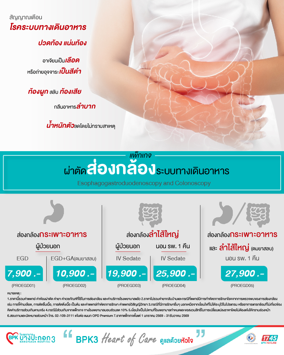 2.ราคาไม่รวมค่ายากลับบ้านและกรณีที่แพทย์มีการทำหัตถการรักษาโรคจากการตรวจพบของการส่องกล้อง เช่น การจี้ห้ามเลือด, การตัดชิ้นเนื้อ, การตัดติ่งเนื้อ เป็นต้น และค่าแพทย์ทำหัตถการรักษา ค่าแพทย์วิสัญญีวิทยา