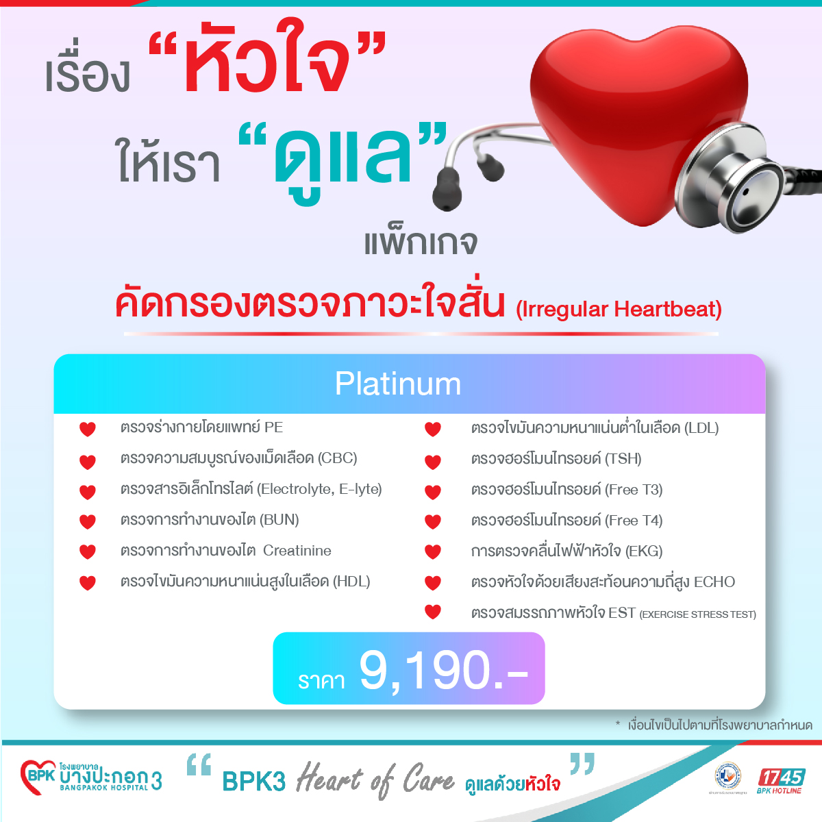 แพ็กเกจคัดกรองตรวจภาวะใจสั่น (Irregular Heartbeat) (EST) +(ECHO) (PLATINUM) ราคา 9,190 บาท
