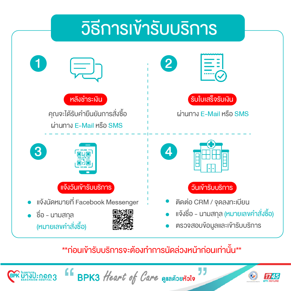 - สอบถามและนัดหมายล่วงหน้า โทร 02-109-3111 กด 0 แจ้งต่อ แผนก OPD Premium